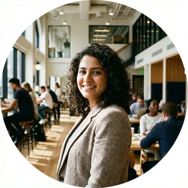 A cartoon drawing of a person with curly hair and glasses, smiling.